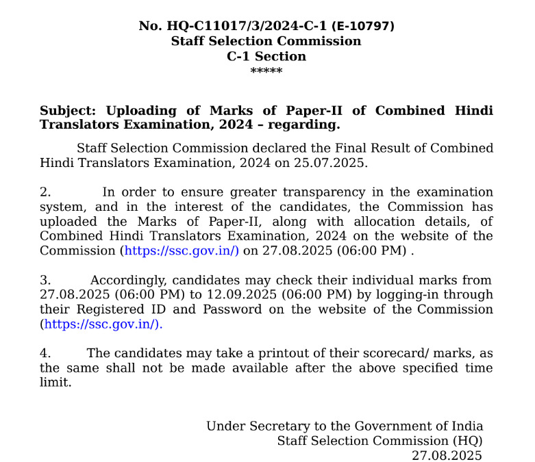 पारदर्शिता सुनिश्चित करने के लिए, SSC ने Paper-II के अंक और आवंटन विवरण आधिकारिक वेबसाइट पर अपलोड कर दिए हैं। उम्मीदवार अपने अंक 27th August 2025 (6:00 PM) से 12th September 2025 (6:00 PM) तक Registered ID और Password का उपयोग करके देख सकते हैं।